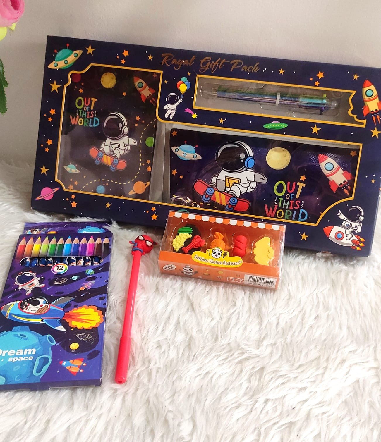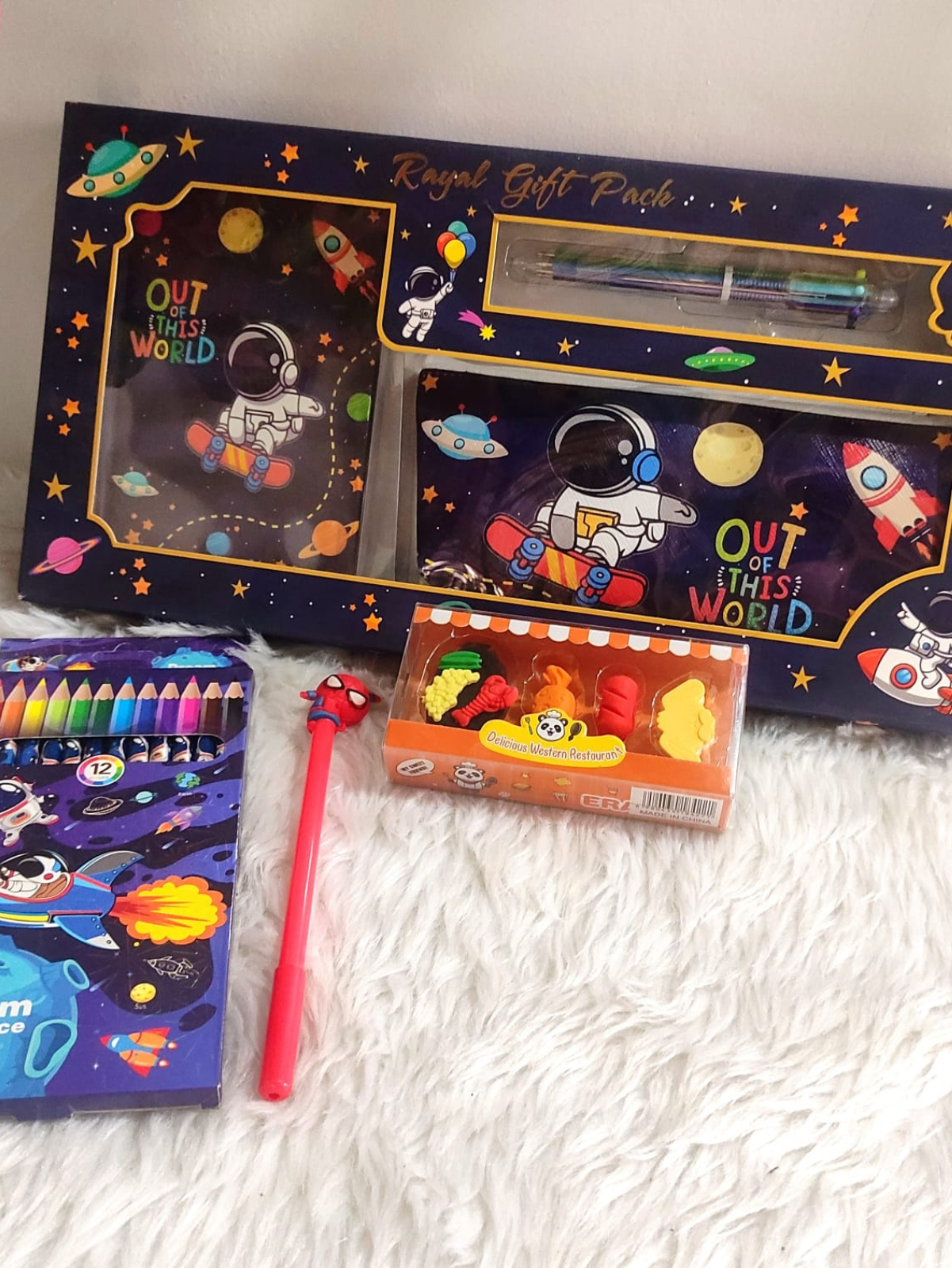 Hamper includes-Dairy, Pouch, Multi Colour Pen, Pencil Colour, Pen & Pack of 4 Eraser