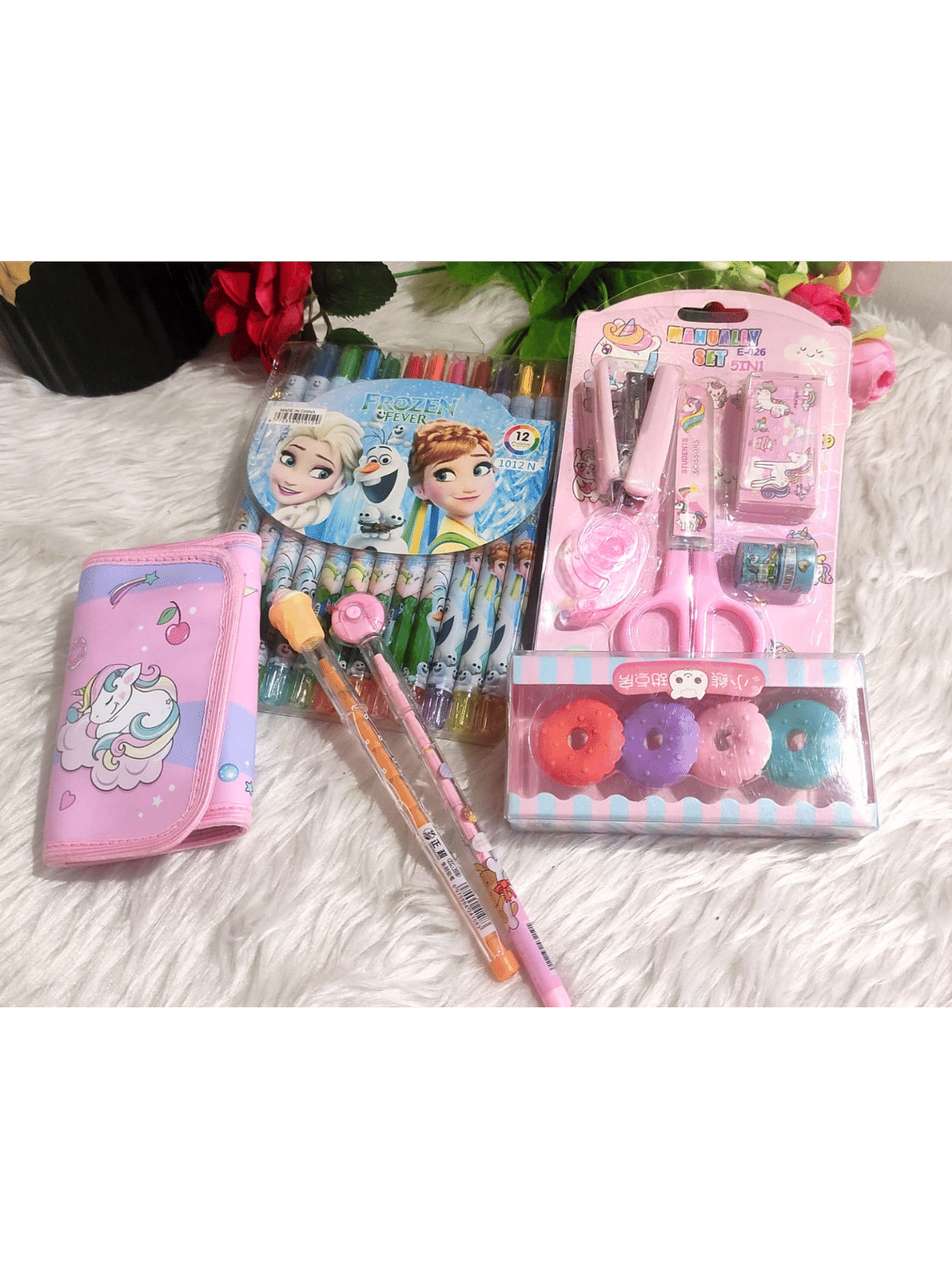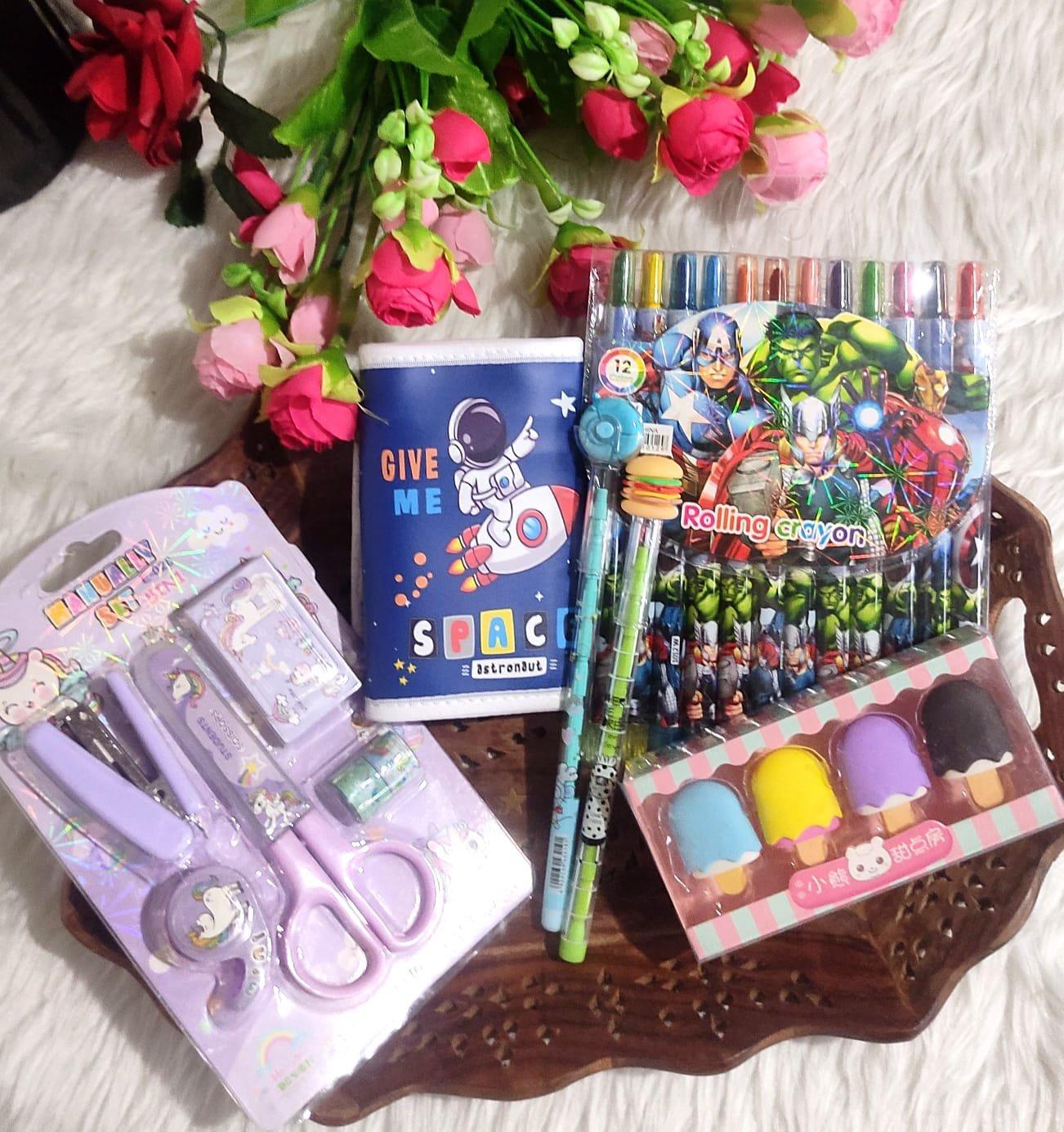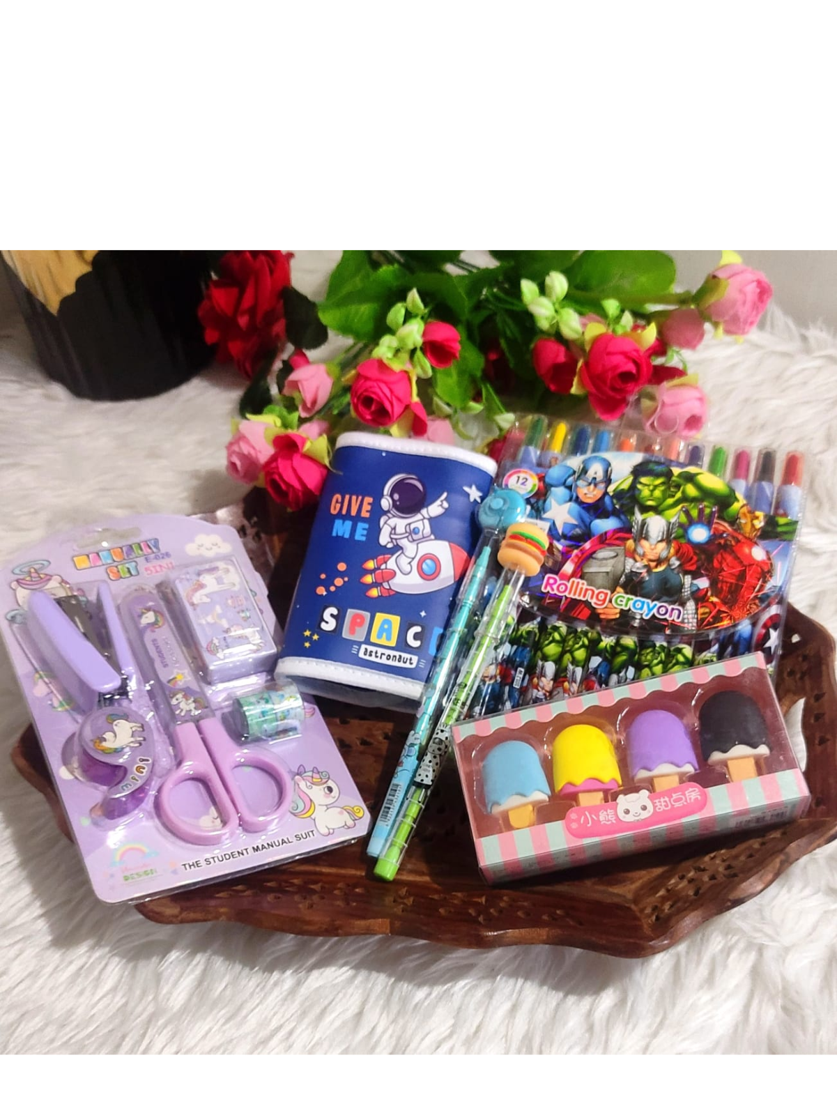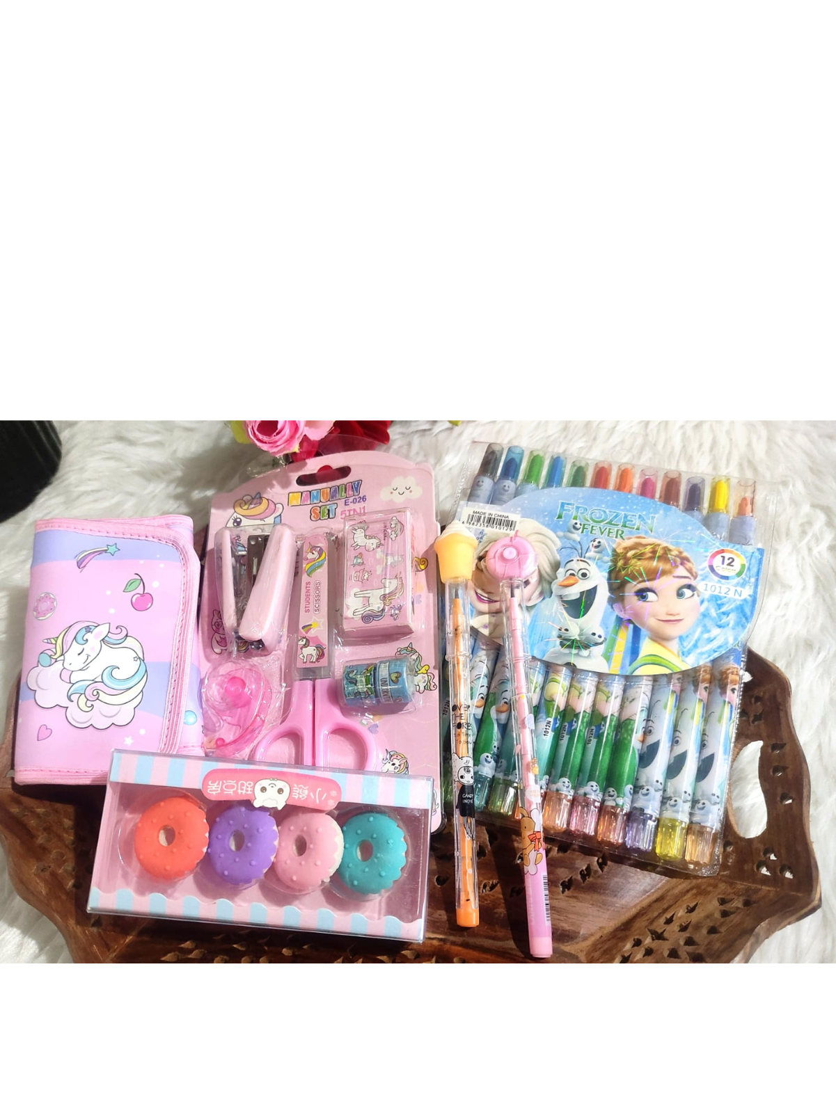 Hamper includes-Wallet, Rolling Crayon, Pack of 4 Eraser, Donuts & Ice Crem Bullet Pencil, Scissors & Stapler Kit